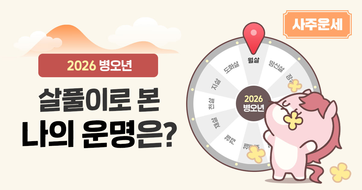 도화살, 망신살, 화개살... 12신살 중 어떤 살이 내게 영향을 미칠까요? 2026년 새해에 다가오는 살을 잘 알고, 그에 따라 움직이면 올 한 해도 잘 보낼 수 있을 거예요. 사주로 보는 병오년은 2026년 2월 5일부터 2027년 2월 4일까지입니다. 운세 이용에 참고하세요!
