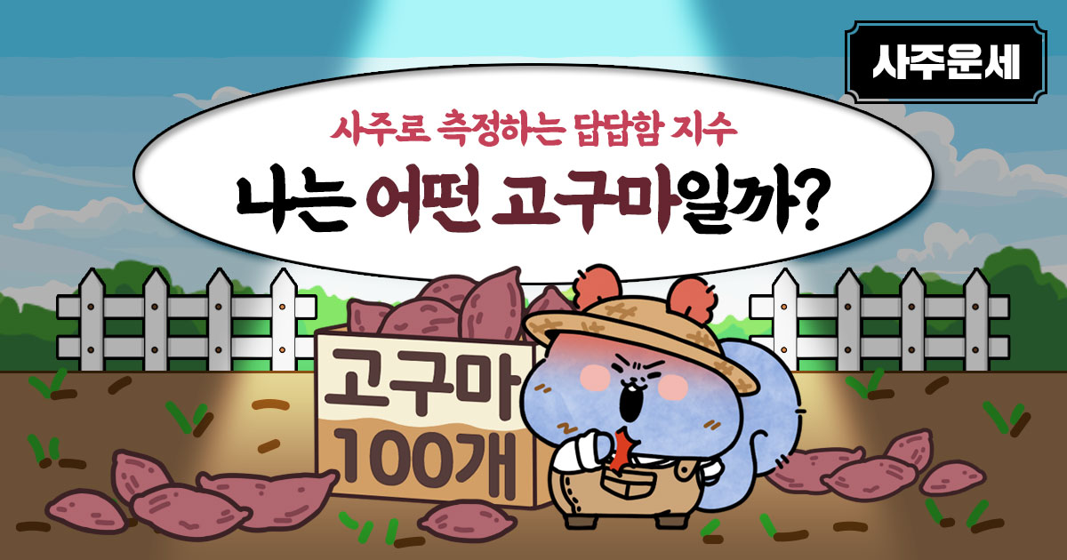 어느 날 갑자기 고구마 왕국에 떨어졌다…?! 이 신비로운 세계에서 당신은 어떤 고구마로 살아가게 될까요? 💧 수분 빼면 시체! 촉촉~한 호박고구마? 😵 목 막힘 1등 공신! 퍽퍽~한 밤고구마? 사주팔자를 통해 당신의 답답한 정도를 측정해드릴게요. 🍠